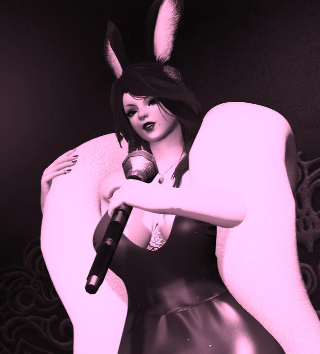 Lord Francel explains that he left her to her own devices as he helped prepare. Focusing on ensuring that the new "Microphones" provided by the Skysteel Manufactuary's collaboration with The Ironworks were set up properly. Marvelous technological wonders that combine Magitek and Aether to project sound in venues. Our Songstress used one for her performance; Joined by a scant number of experienced Musicians, and even Count Artoirel on Piano for her musical number(s).The Count was not available for an interview, but his love of music and appreciation for the arts is well known amongst those in Ishgard. Surely he offered his services to ensure the night went smoothly for all involved.And with that, we come to our star of the evening. I have attended many performances on behalf of our illustrious pressroom. Found myself in front of anything that ranged from symphonies and operas to lounge singers in the seedier parts of Ul'dah. I've witnessed talents performing on the streets, and even some riding down those same streets; Individuals who couldn't go a minute without humming a tune. I dare say I have heard a myriad of lyrical styles. Some of which even involved battling with wordplay.So reader, when I say this woman blew me away? She Blew Me Away.With the oncoming snow storm, the stage had a backdrop of beautiful crimson drapery. Meant to provide a buffer against the chill coming in from the East. Even with that and the shine of the lights(Also a marvel provided by the collaboration between Skysteel and the Ironworks), it was blisteringly cold. Yet, our woman of the hour walked out in a sleeveless, backless dress. Nothing upon her shoulders but a white fur boa and her gorgeously long hair. I managed only to get one passable photo of her, and I fear the print of the newspaper will diminish its effect. So, I shall describe her to you;